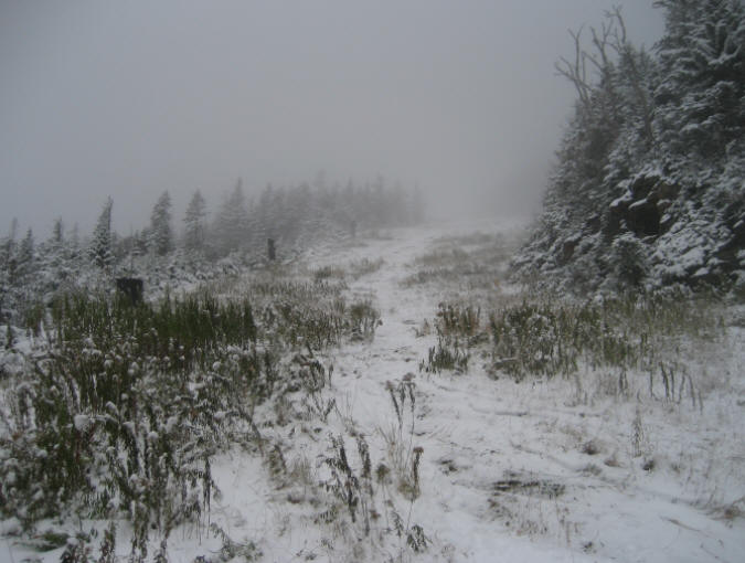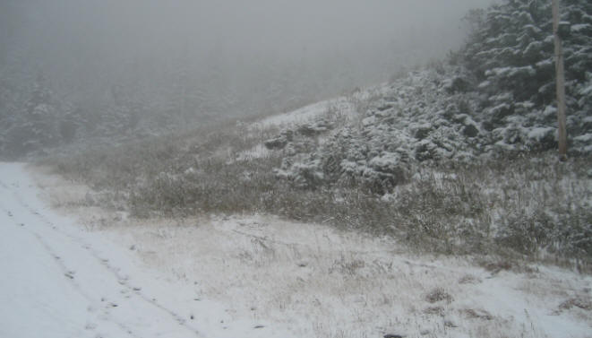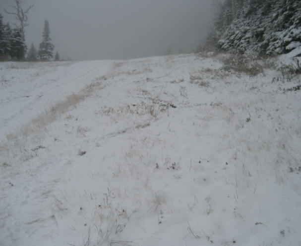 ![]() I had to "ski" down through the pucker brush, there was only an inch or two of snow on the gravel access road on the left. |